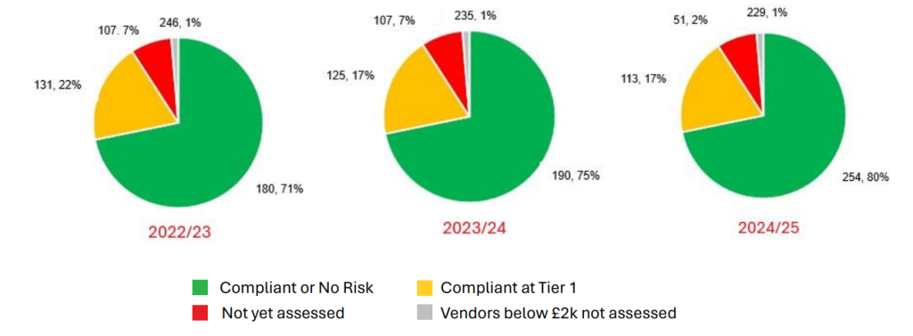 51 suppliers amounting to 2% of total spend have yet to be assessed or following initial assessment have work to do to demonstrate compliance at Tier 1 level which has remained the same compared to the previous reporting period.